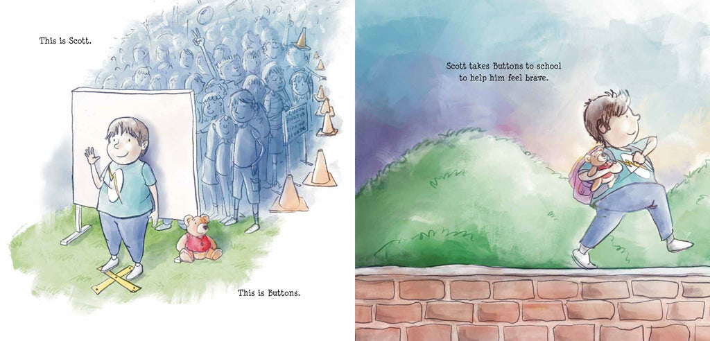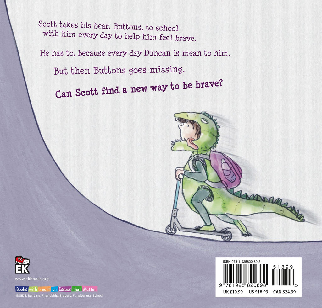Scott takes Buttons to school with him every day to help him feel brave. He has to, because every day, Duncan is mean to him. Just this week, Duncan has called him names, ripped his painting, and stolen his snack from his lunchbox. Then Buttons goes missing. With his one comfort gone, Scott has to look elsewhere to find his brave, and much to his surprise, he does.