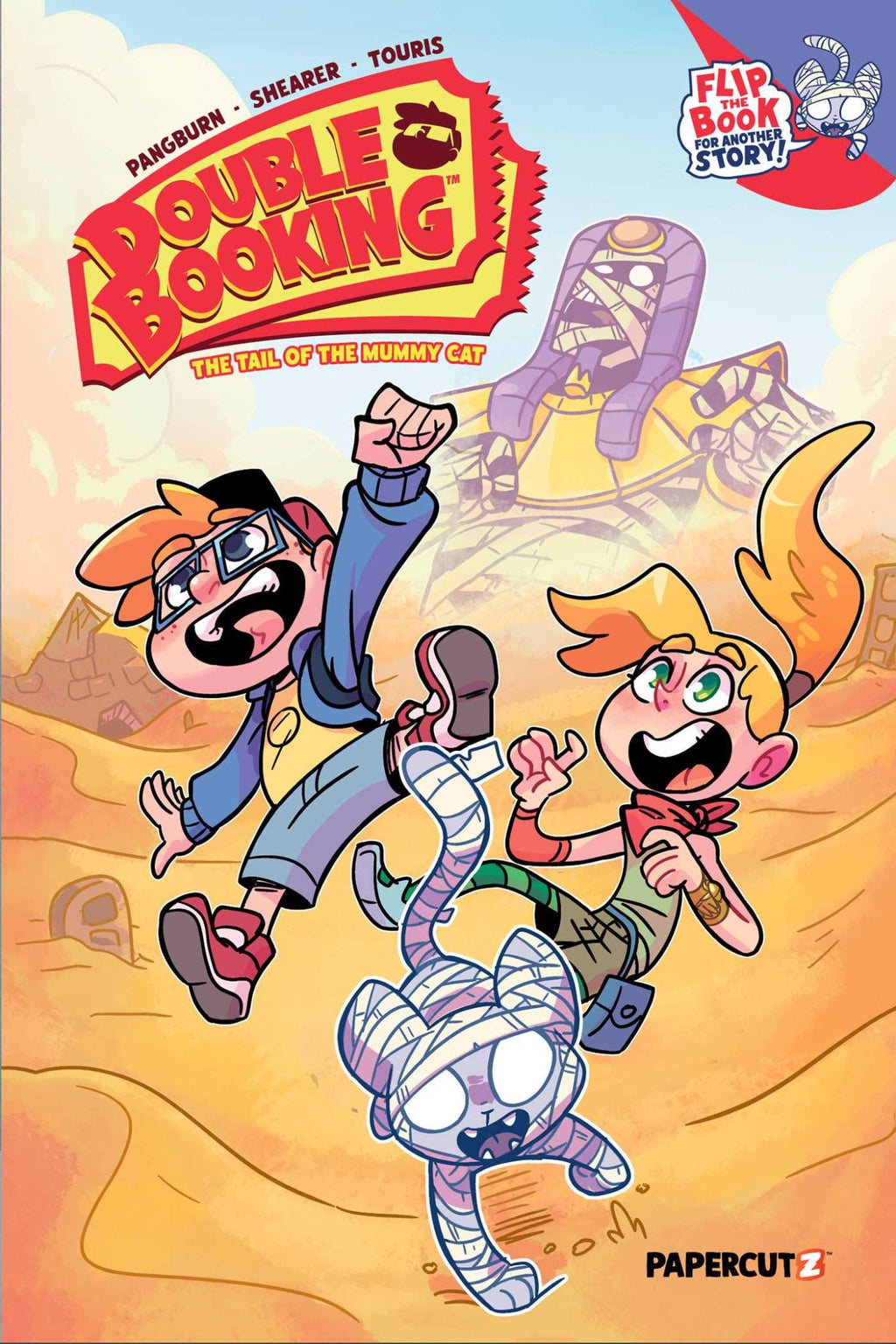 While on a trip to Egypt, two siblings, Otto and Nan, stumble upon a sarcophagus. And they accidentally free a mummy cat from a pharaoh's chamber! Now tasked with finding it, their resulting adventure has them exploring the city, learning historical facts, saving each other from danger, and discovering truths about life.What's more, they're going to survive the same adventure – twice! See both perspectives in this flip graphic novel, written by real-life siblings Kim Shearer and Chas! Pangburn.