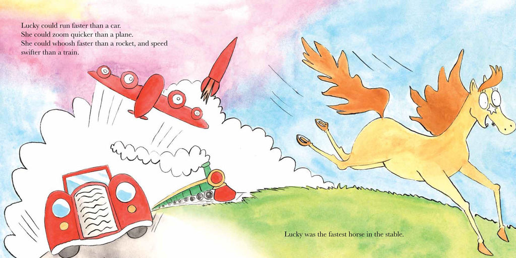 Captivated by the glamour of elegant hats and high-heeled shoes, a spirited racehorse named Lucky, who is the fastest horse in the stable, becomes determined to emulate race-day fashion in the quest to win the cup, only to discover that the best shoes to wear in order to win the race are her own lucky horse shoes—an amusing and light-hearted story of the pros and cons of impractical footwear.
