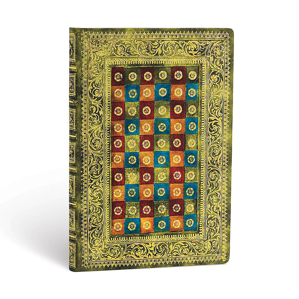 A Venetian morning is alight with marvels. We have captured some of the splendid daybreak palette of the city with this Verde journal cover. The design dates back to the early 1600s and was originally crafted from red morocco leather with gold borders, checkers of green, red, blue and brown in the midfield, lace fillets and marbled endpapers.