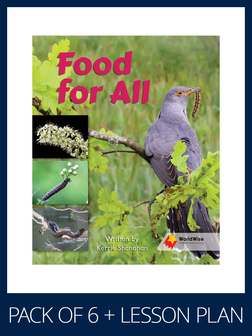 This pack includes six copies of the student book (9781761072185 – as described below) and a lesson plan (9781761072628).Title Information:­Food for All describes a simple food chain, explaining what animals eat and what eats them. It poses questions that require the reader to make predictions before finding the answers on the following pages.Content vocabulary: bird, caterpillar, eat, plant, snakeKey concepts:All living things need food to live and grow. Some animals eat plants. Some animals eat other animals.Reading Strategies: Reading left to right and return sweepRelated resource: WW LPL1 Food for allSeries Information:WorldWise is a high-interest literacy program that encourages inquiry and questioning while extending knowledge in science and a range of STEM topics linked to the curriculum. This engaging program teaches reading strategies simultaneously with natural, earth and physical science concepts – reflecting the diversity of the world students live in.Students will develop strategies and skills to read informative texts across a range of text types while they learn to become informative text writers. With an assortment of text types on offer, themes and concepts are introduced and revisited across the reading stages, building on initial concepts with increasing complexity.WorldWise Lesson Plans support each Student Book, offering practical, systematic and easy-to-implement instructions. These visually appealing resources integrate oral language, vocabulary development, fluency and comprehension, writing and phonics.WorldWise Investigations is a web-based tool that provides extension activi